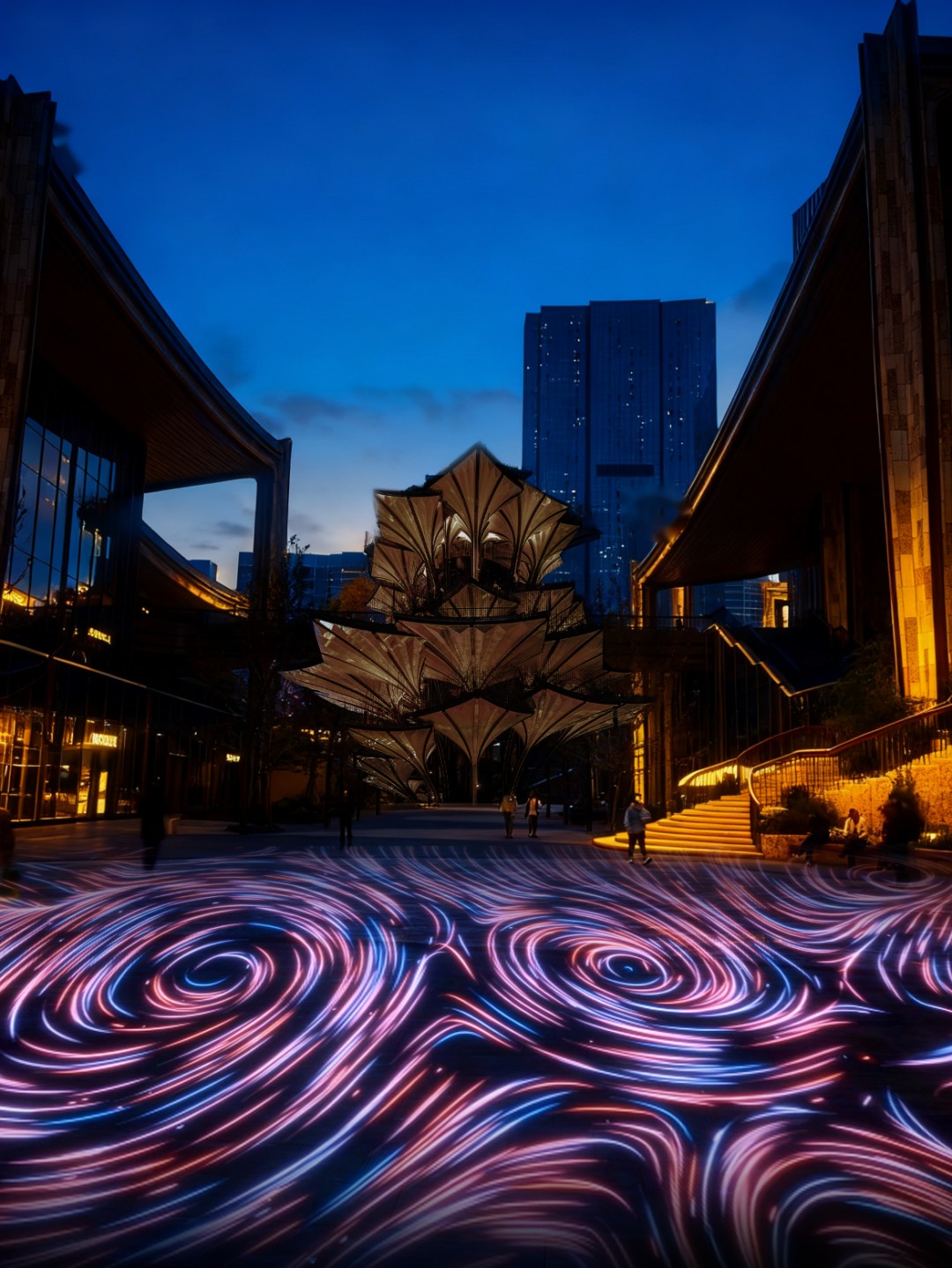 在“流动”这个篇章,打破了传统照明的静态呈现模式,核心支撑为动态照明系统和地面互动技术,打造出“流转星河”的沉浸式场景。设计采用了感应式照明技术,可以把观众的行走轨迹转化为光的流动轨迹,让观众成为了“光影参与者”。精准控制的灯光通过渐变光效、动态光影序列模拟星河流转的自然韵律,地面照明和空间光环境形成呼应。