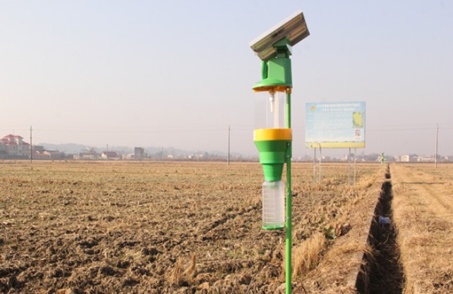 在湖南省湘潭市湘潭县石潭镇省级万亩综合示范片核心基地的田垄间,矗立着40盏太阳能风吸式杀虫灯。